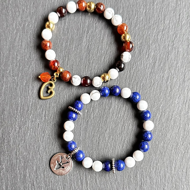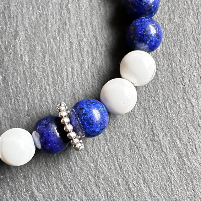 Der tiefblaue Lapislazuli steht für Weisheit, Intuition und Selbstvertrauen, während der Howlite Ruhe und emotionale Ausgeglichenheit schenkt.