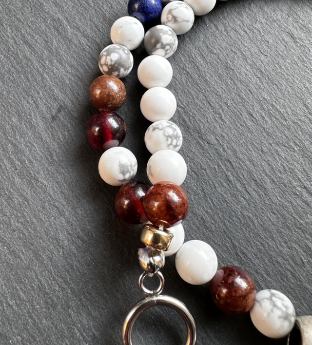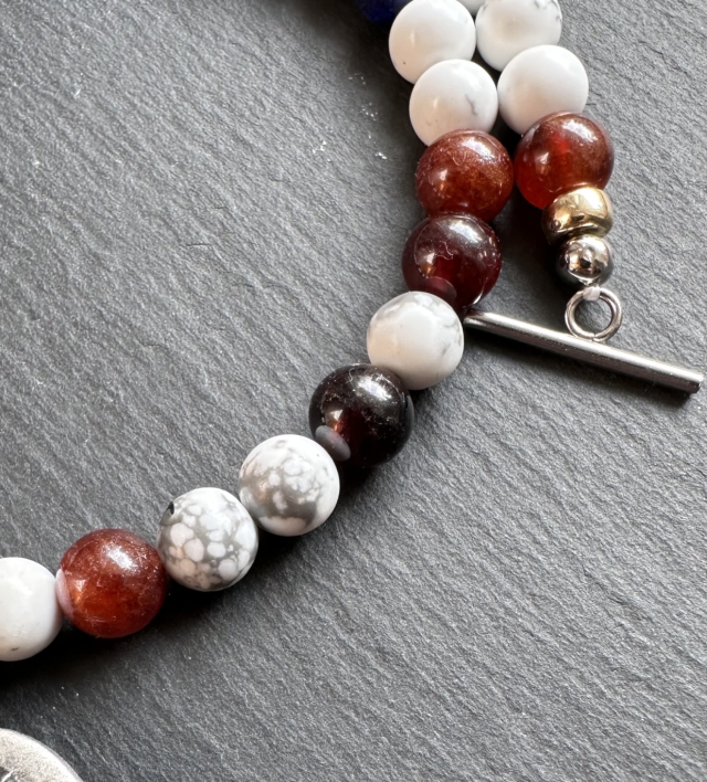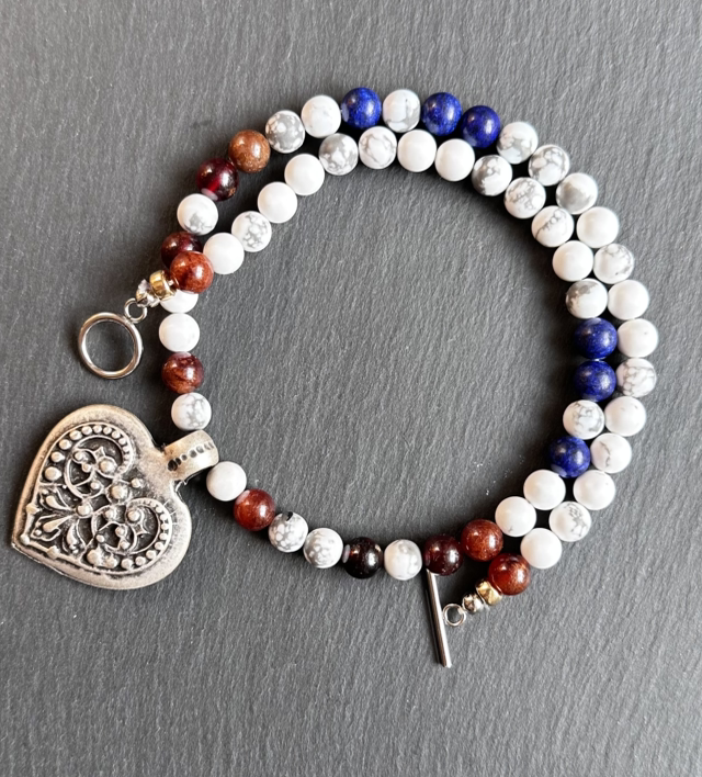 Die Alpenchic Herzstück Kette vereint die Farben der Alpen in einem einzigartigen Schmuckstück: kräftiges Rot des Granats, tiefes Blau des Lapislazuli und sanftes Weiß des Howlite symbolisieren Leidenschaft, Klarheit und innere Ruhe. Ein liebevoll gearbeitetes Alpenchic Metallherz bildet das emotionale Zentrum der Kette, während der Stiftverschluss das Design elegant abrundet und für sicheren Halt sorgt.
