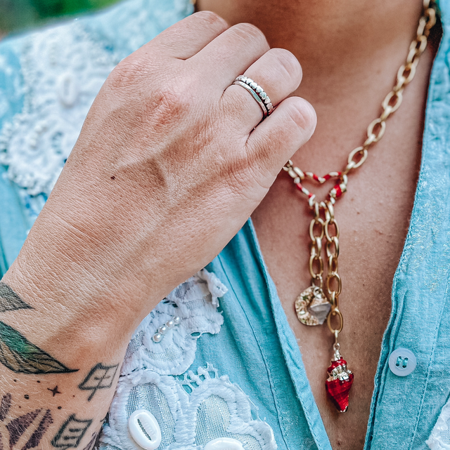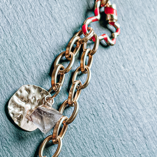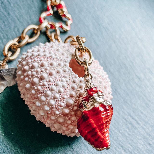 Eine Kette – viele Möglichkeiten: Die Goldkette mit Schmetterlingsverschluss in Gold/Rot ist ein wahrer Verwandlungskünstler. An dem zarten Verschluss hängen zwei feine Goldketten – eine mit einem leuchtend roten Muschelanhänger, die andere mit einem runden goldenen Blatt. Beide Ketten lassen sich einzeln entnehmen, sodass du die Kette auch schlicht nur mit dem Schmetterlingsverschluss tragen kannst.