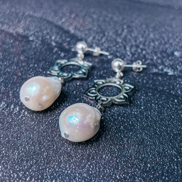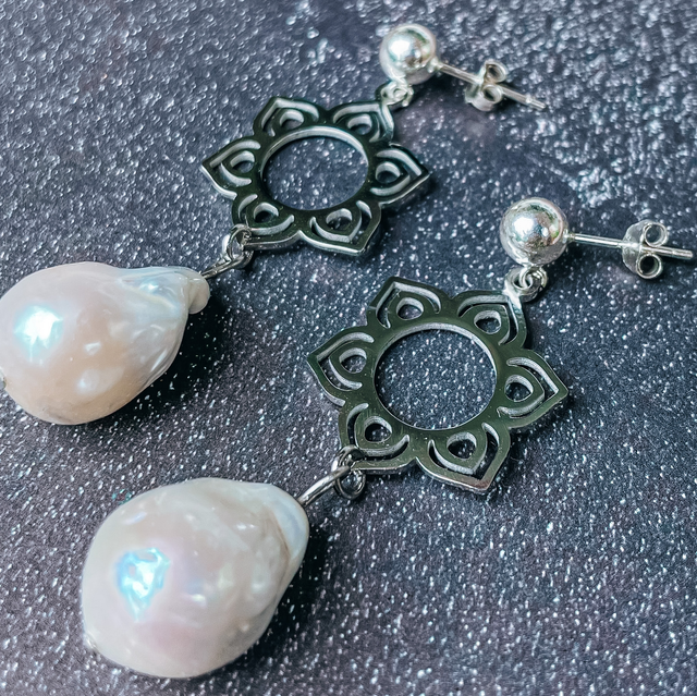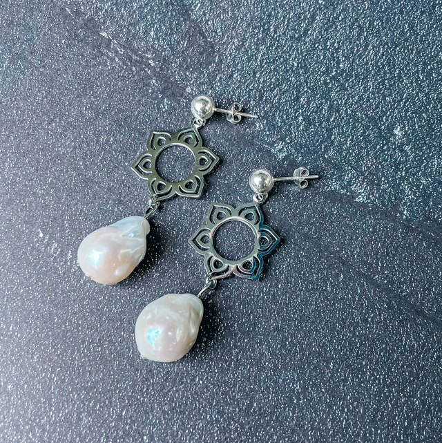 Diese Ohrringe vereinen klassische Schönheit mit filigraner Ornamentkunst: Eine große weiße Perle wird von einem kunstvollen Mandala-ähnlichen Ornament getragen und durch einen hochwertigen 925 Silber Stecker vollendet. Die Kombination aus strahlender Perle und zarter Ornamentik macht sie zu einem besonderen Schmuckstück, das Weiblichkeit, Harmonie und Eleganz ausstrahlt.